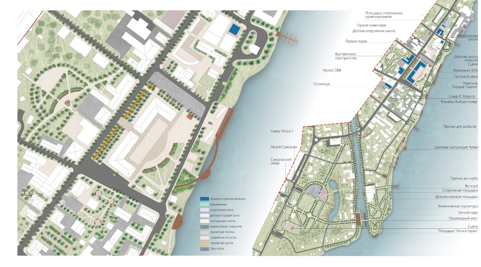 ▪ вдоль береговой линии на набережной предусмотреть, помимо пешеходной сети с различными видами покрытий, основной причал, причал для яхт-клуба и причалы для рыбаков.