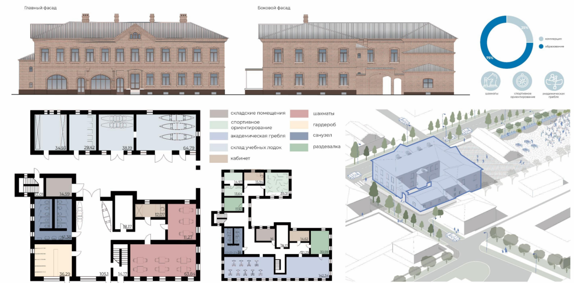 - В доме по адресу ул. Карла Маркса, 33 в настоящее время расположена Новоладожская детская школа искусств. В перспективе предлагается перенести школу в здание по адресу проспект Карла Маркса, 34, а в доме 33 обустроить детскую спортивную школу. Основные предлагаемые секции – академическая гребля и спортивное ориентирование (рис. 10).