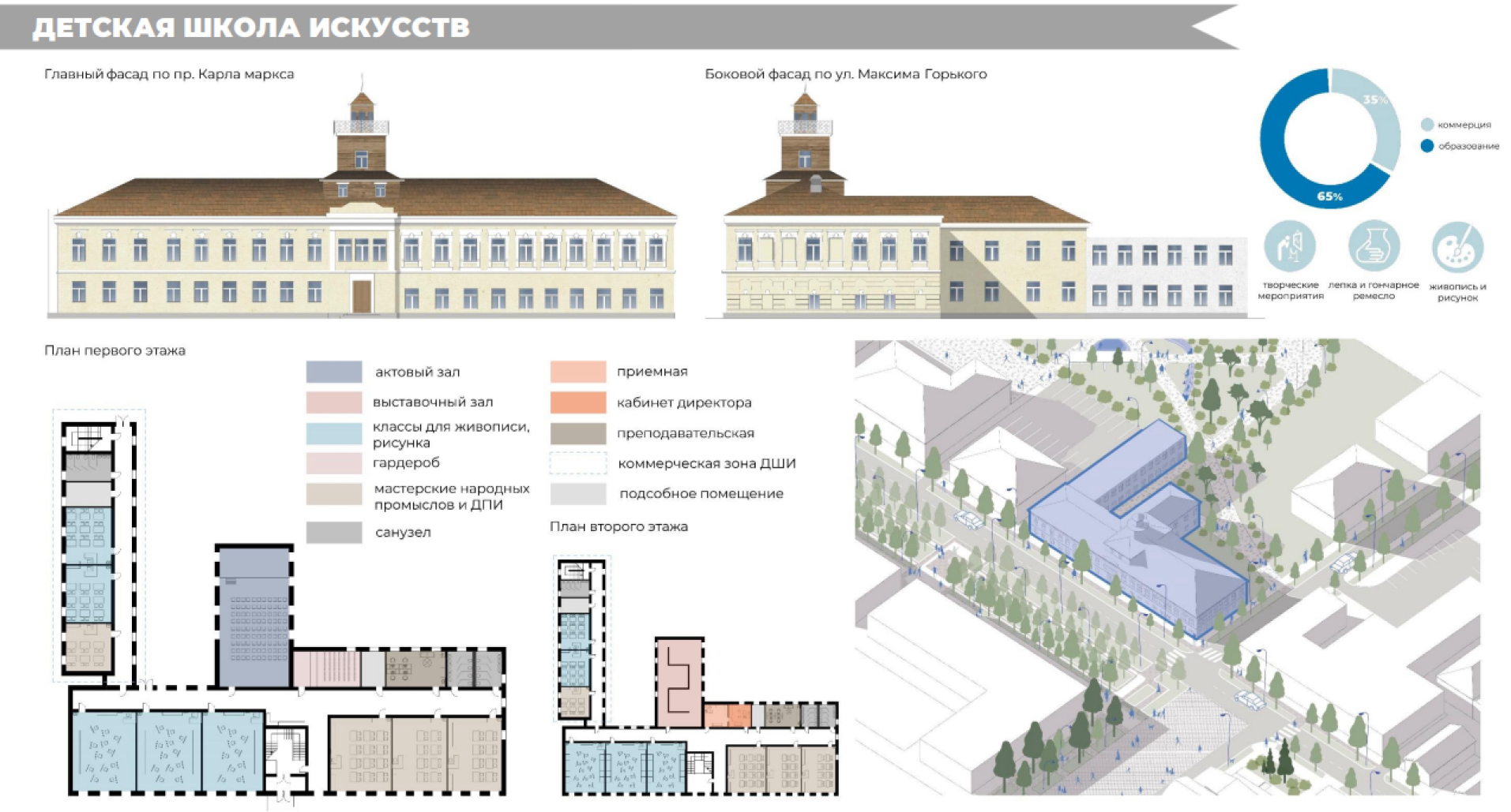 - Детскую художественную школу предлагается разместить в доме по ул. Карла Маркса, 34 для организации многофункционального пространства, включая живопись, рисунок, лепку и гончарное ремесло, различные тематические мастер-классы с привлечение Союза художников (рис. 11).