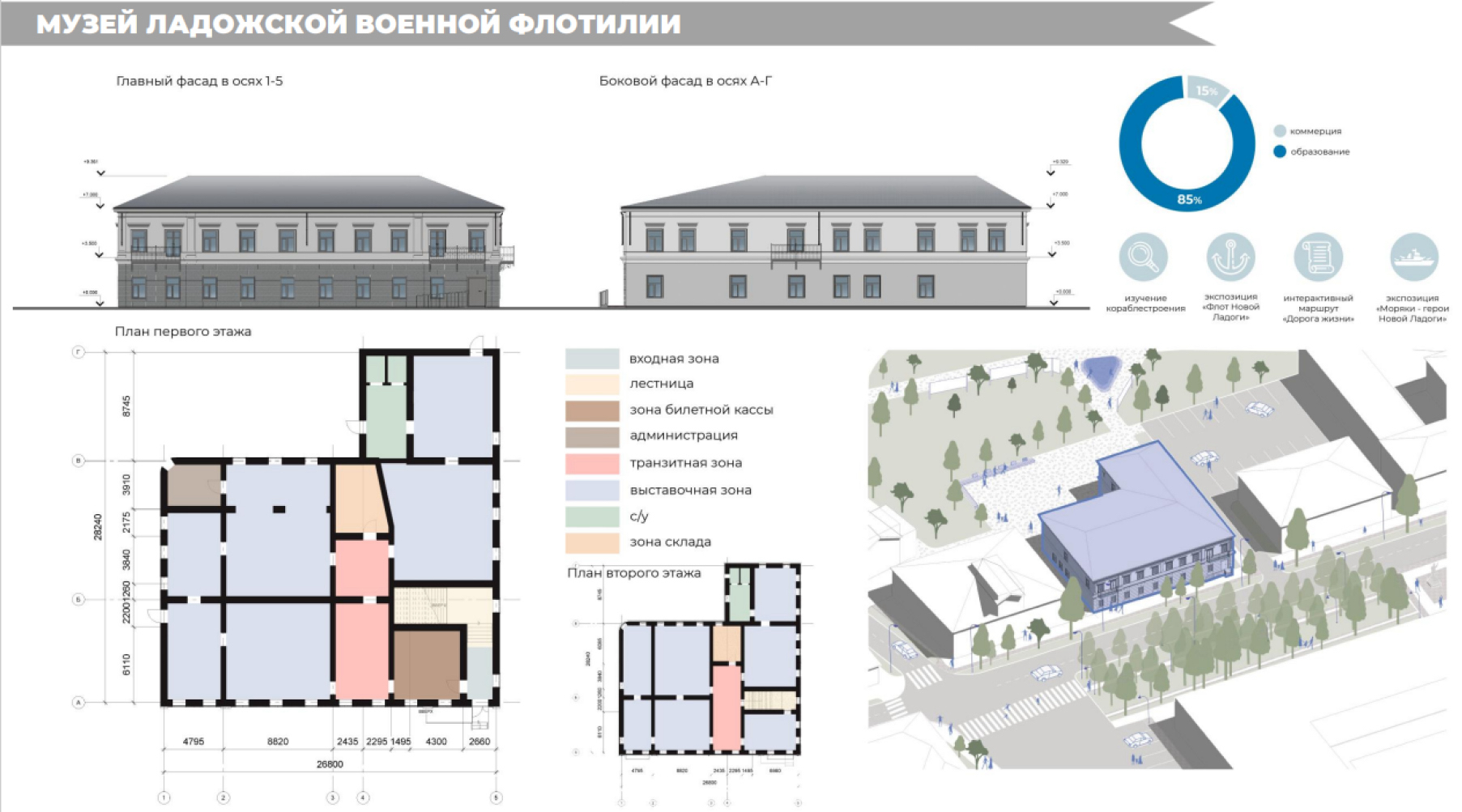 Рис. 12. Предложения по восстановлению и приспособлению ОКН штаб Ладожской военной флотилии по адресу ул. Карла Маркса, 30 под современное использование. Разраб. Господынько Е.Я., под рук. Перьковой М.В., Ладик Е.И.