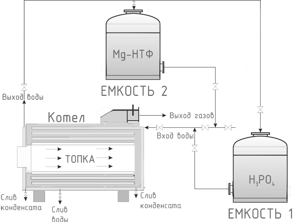 Полученные результаты подтверждают механизм защитного действия и эффективность антикоррозионной защиты поверхности металлов путем нанесения защитных покрытий. Определяющим фактором продолжительности защитного действия является толщина покрытия. Нанесение защитных покрытий позволит существенно снизить расход реагентов при ингибировании солеотложений и коррозии. В качестве примера на рис. 5 представлена принципиальная схема получения защитного покрытия на внутренней поверхности водогрейных котлов, предназначенных для отопления и горячего водоснабжения жилых, производственных, сельскохозяйственных, административных зданий и сооружений.