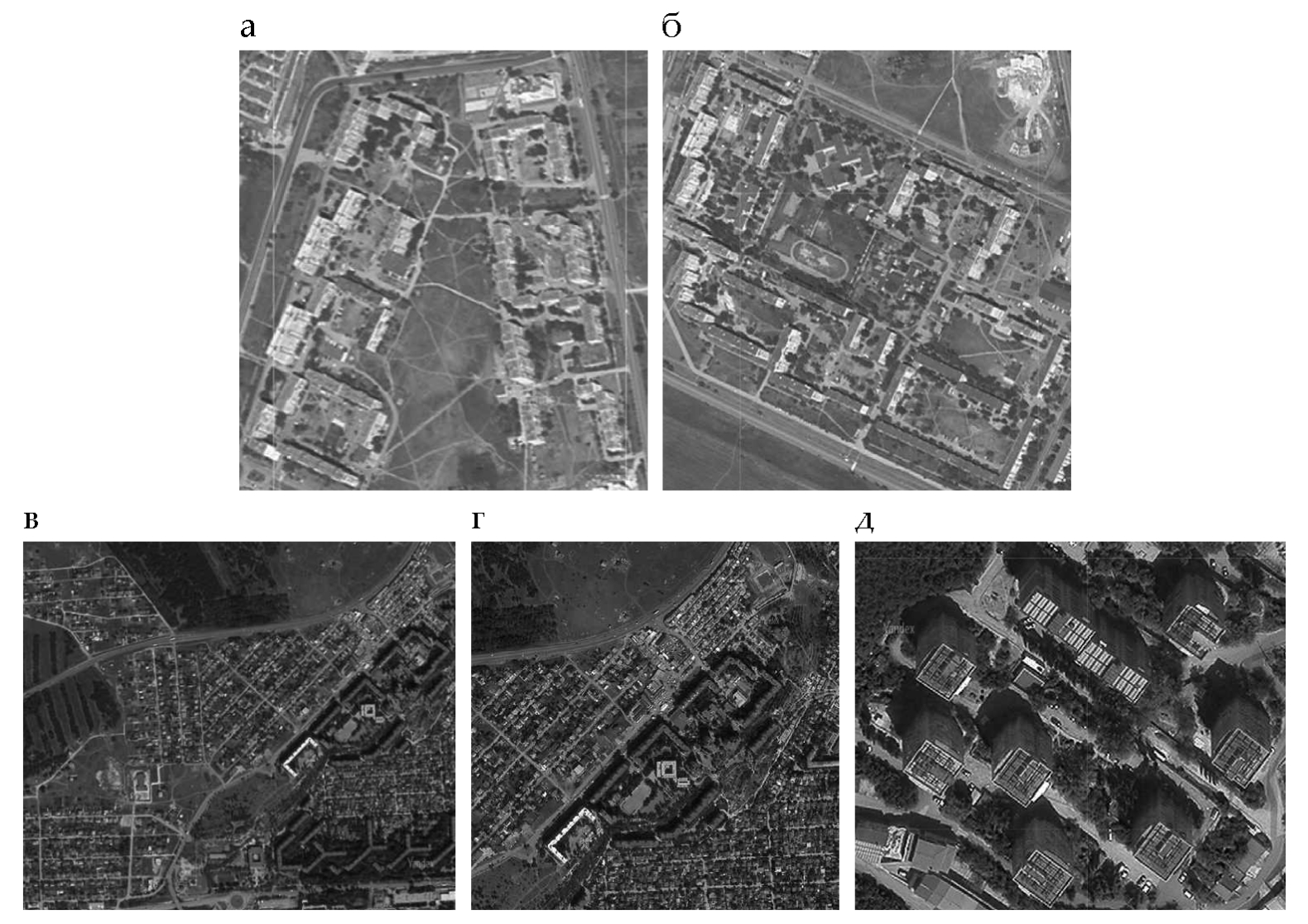 Рис. 1. План микрорайона: а – мкр. «Марат – 5», г. Керчь; б – мкр. «Марат – 4», г. Керчь; в – мкр. «Маршала Жукова – поселок депортированных народов», г. Симферополь; г – мкр. «Маршала Жукова – многоэтажная жилая застройка», г. Симферополь; д – группа из 8 МКД по ул. Октябрьской, г. Алушта
