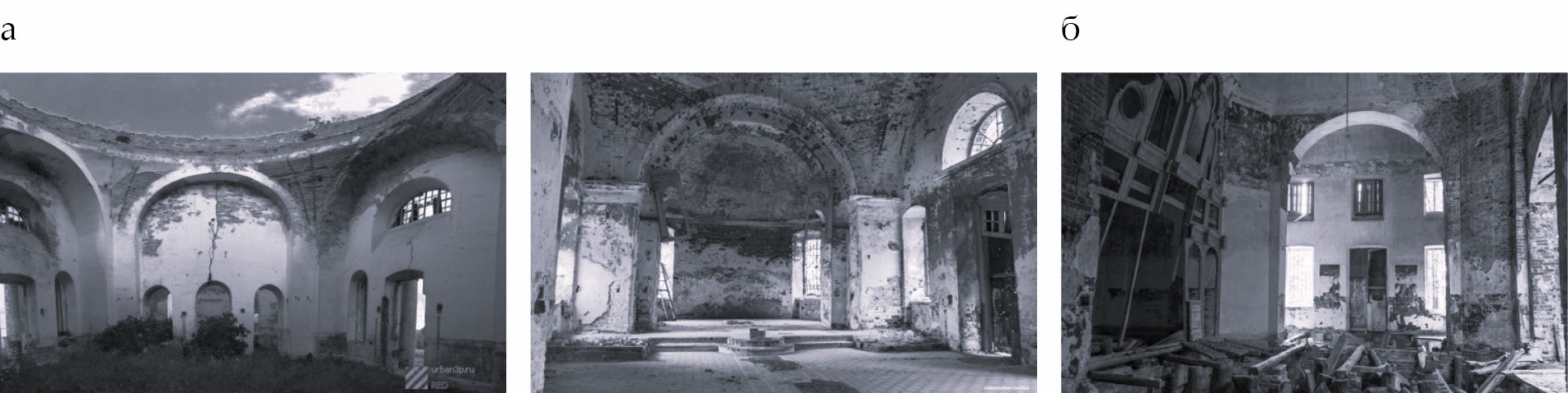 Рис. 3. Примеры пристенных угловых опор в интерьерах центральной части храма: а – Покровский храм с. Засечное, 1846 г., Никольский храм с. Чернопоселье, 1839 г.; б – Никольский храм с. Казарка, 1833 г.