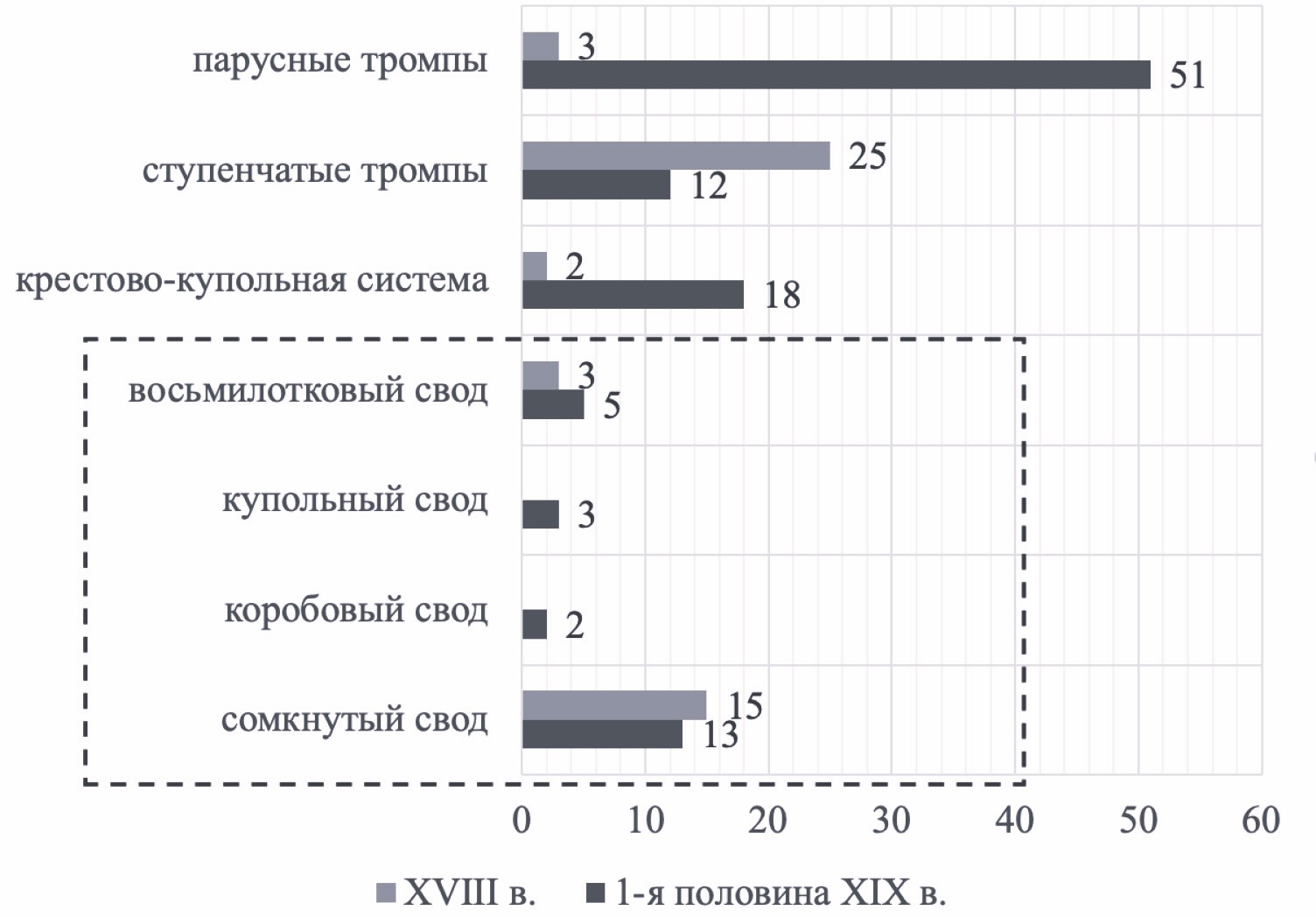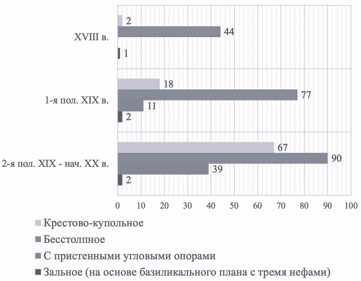 Рис. 4. Соотношение конструктивных решений в храмах XVIII – первой половины XIX в.