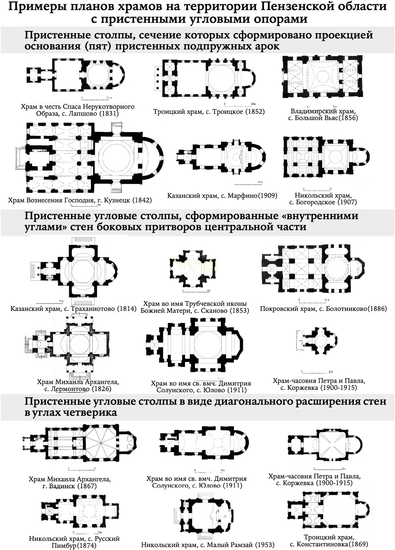 Таблица 1. Примеры планов храмов на территории Пензенской области с пристенными угловыми опорами