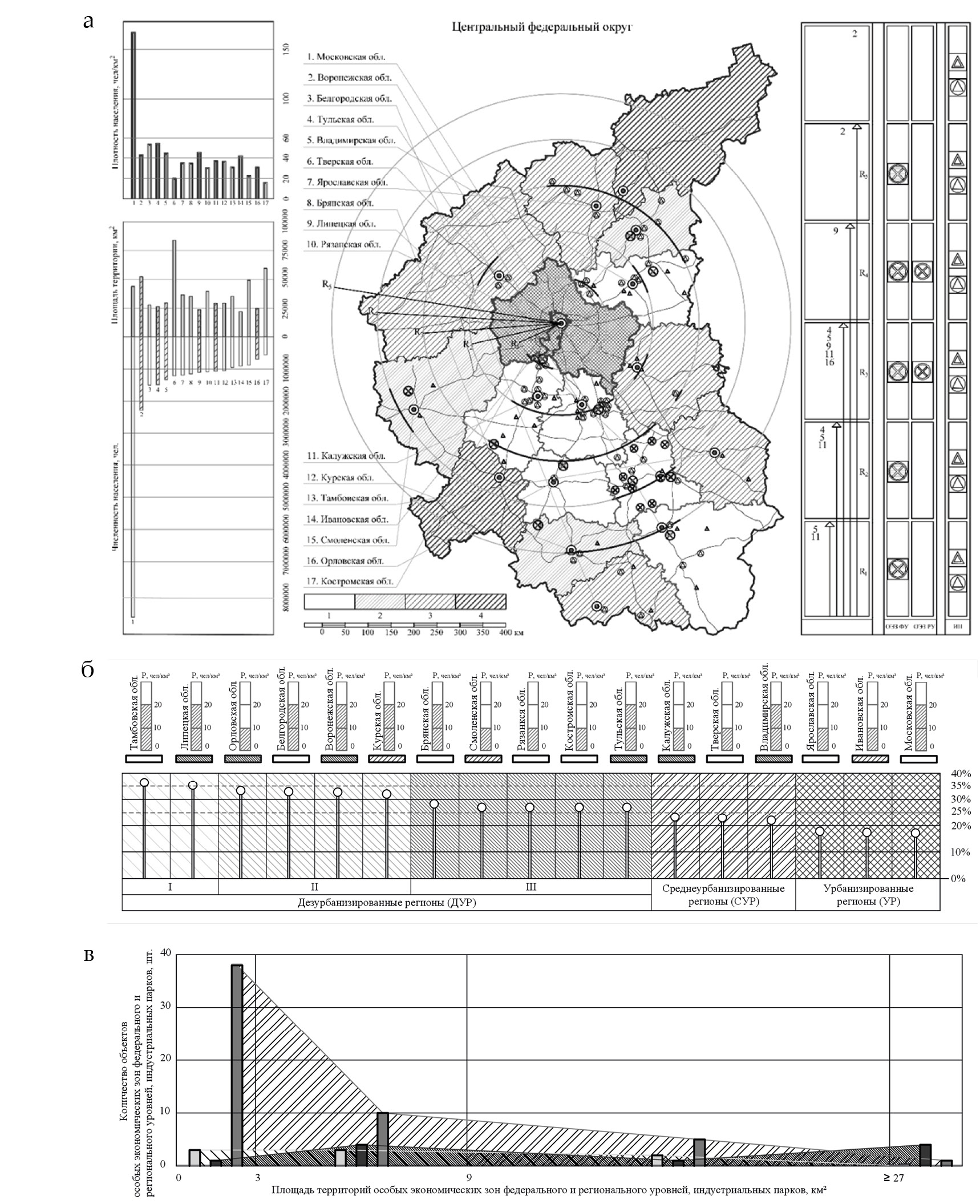 Рис. 1. Результаты комплексной оценки процесса формирования особых экономических зон и индустриальных парков и территориальных системах регионального уровня: а ‒ специфика формирования особых экономических зон и индустриальных парков в существующей системе расселения Центрального федерального округа; б ‒ранжирование регионов Центрального федерального округа с учетом места и роли подсистемы сельского расселения в процессе их формирования; в ‒ группировка исследуемых особых экономических зон и индустриальных парков