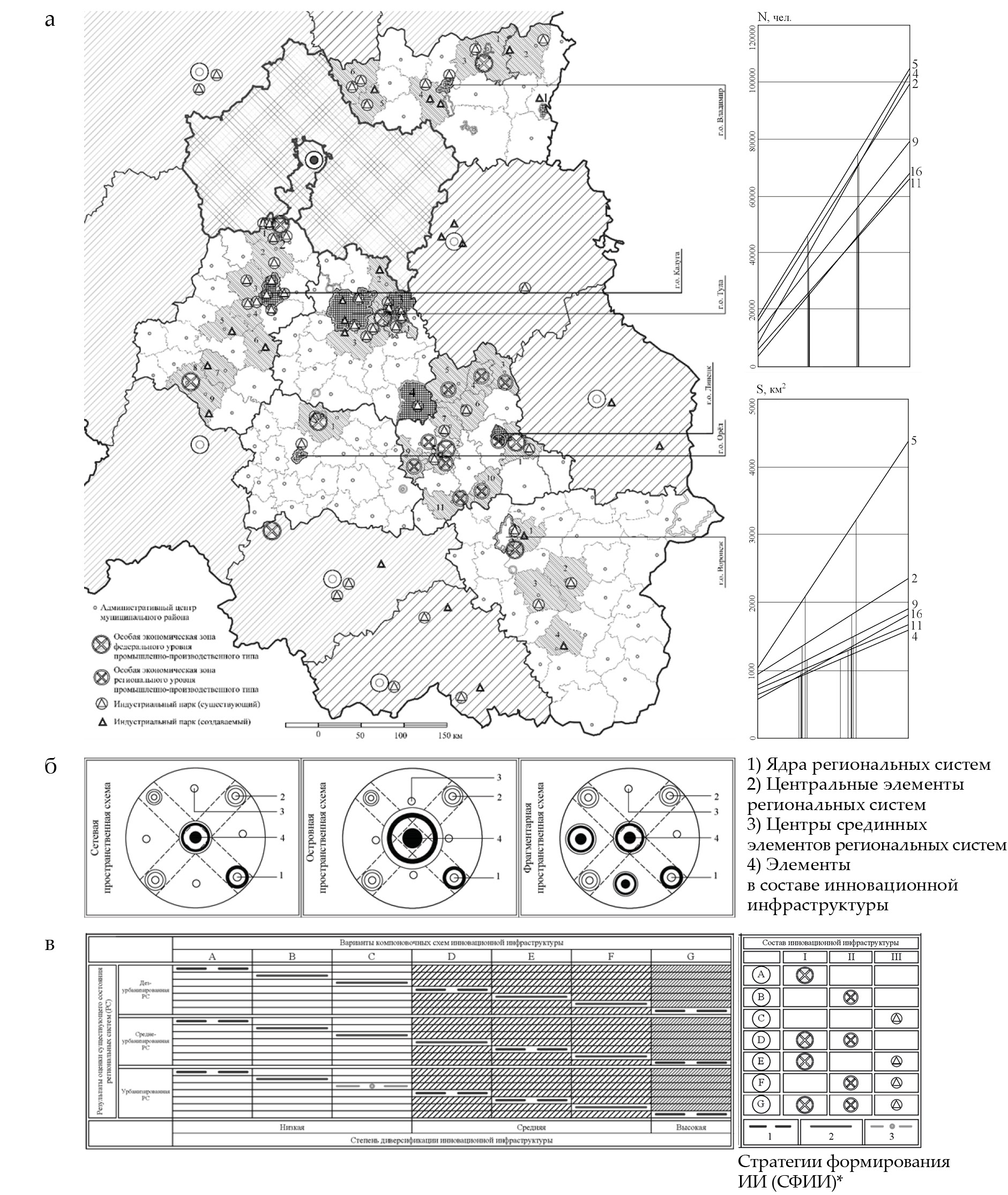 Рис. 3. Методологические основы стратегирования изменений существующего состояния региональных систем посредством формирования инновационной инфраструктуры: а ‒ тенденции формирования инновационной инфраструктуры в региональных системах; б ‒ пространственные схемы формирования инновационной инфраструктуры в региональных системах; в ‒ варианты градостроительных решений на основе стратегий формирования инновационной инфраструктуры региональной системы