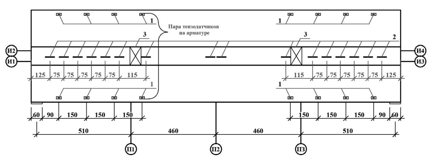 6. Рис. 5. Расположение тензодатчиков, прогибомеров и индикаторов на опытных образцах: 1, 2 – тензодатчики с базами 10 и 50 мм соответственно; 3 – зоны приложения испытательной нагрузки; П1÷П3 – прогибомеры; И1÷И4 – индикаторы