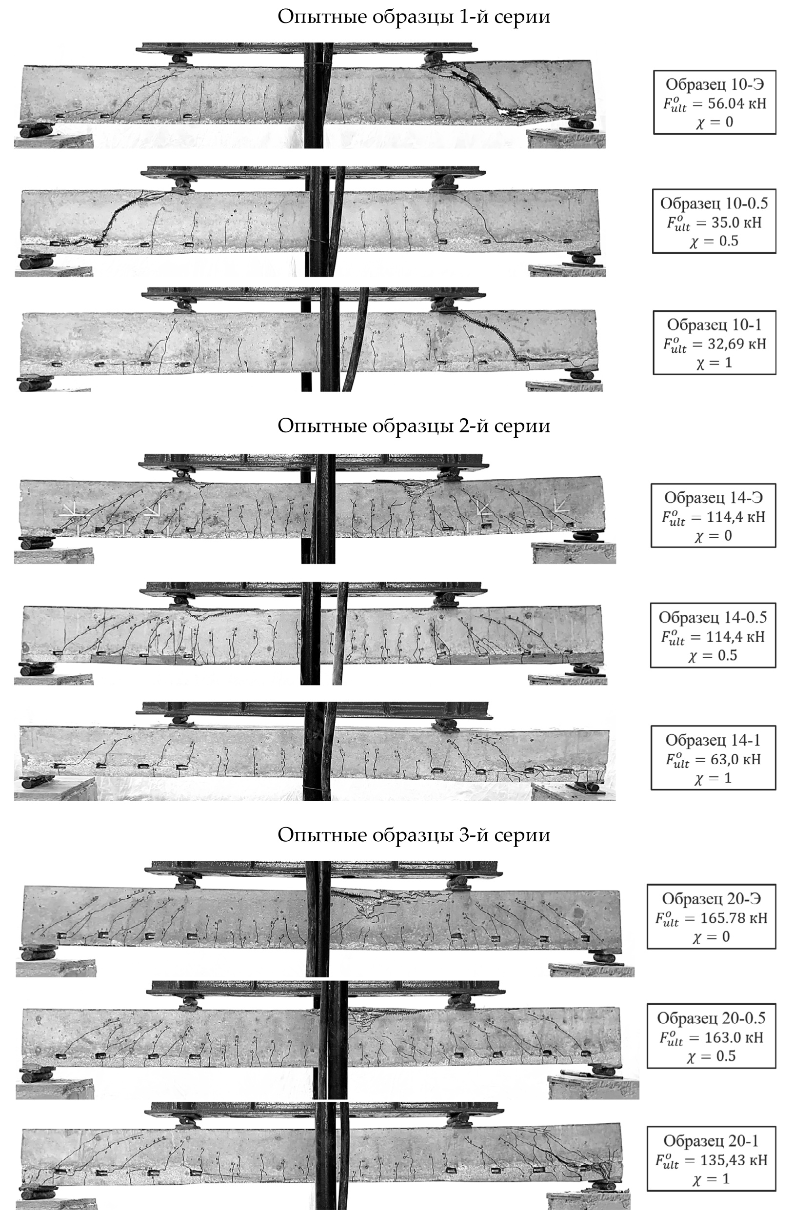 8. Рис. 7. Вид образцов 1‒3-й серий после испытаний: F⁰ᵤₗₜ – опытная разрушающая нагрузка; χ ‒ степень разрушения защитного слоя