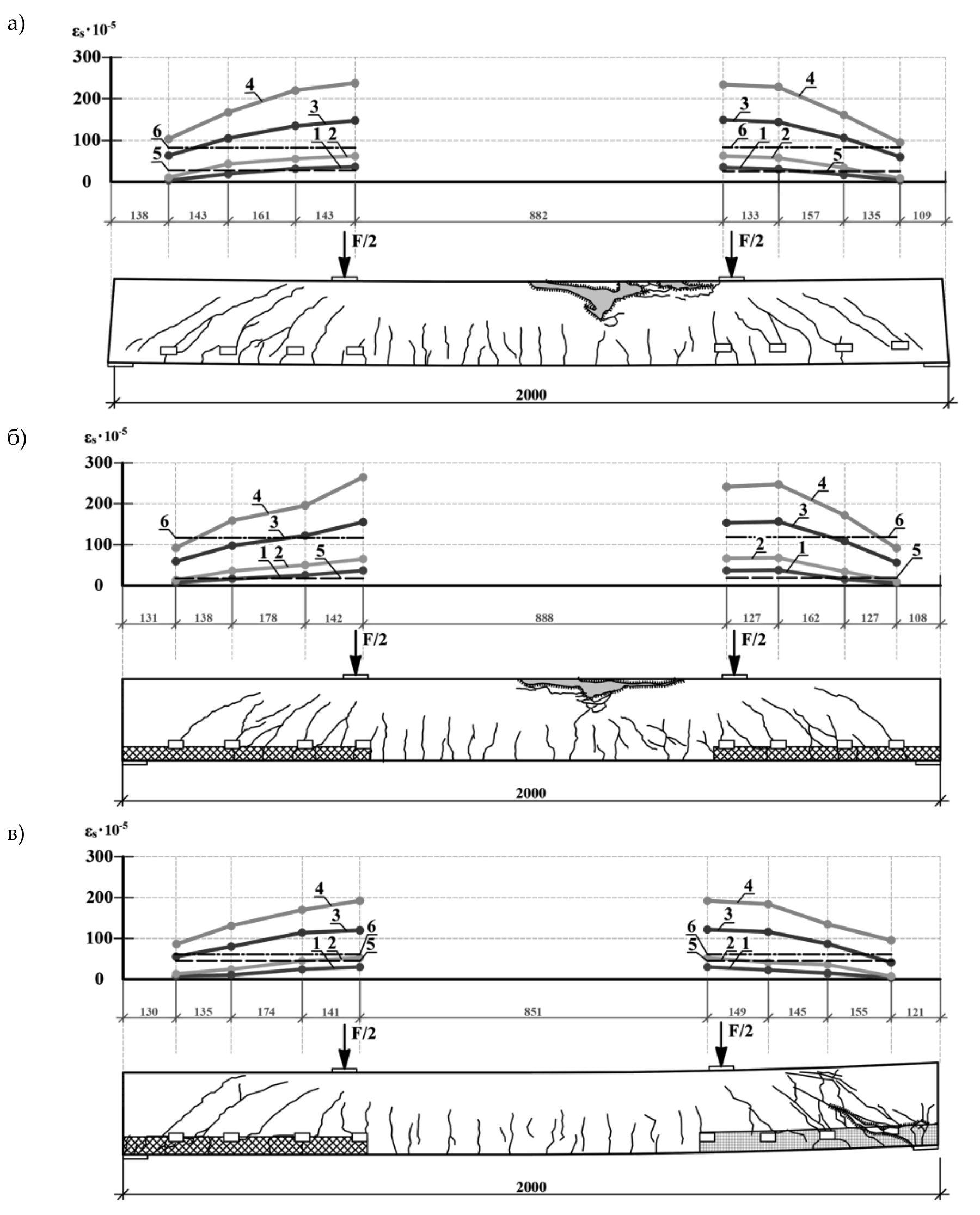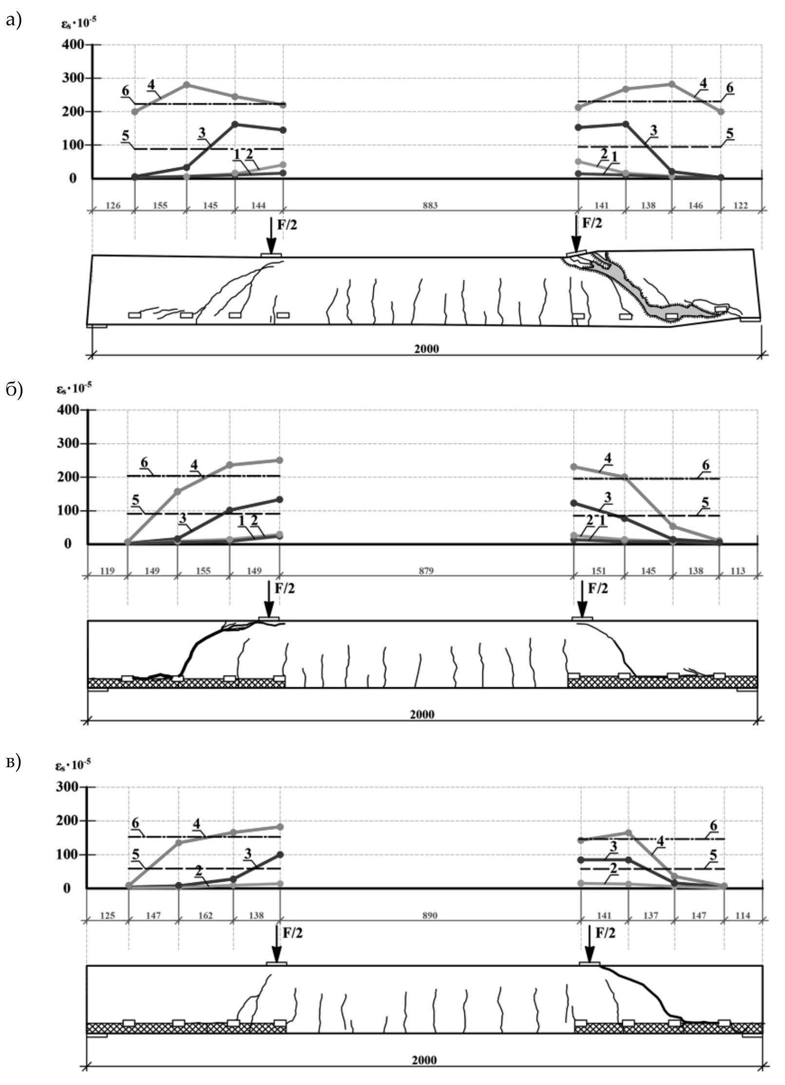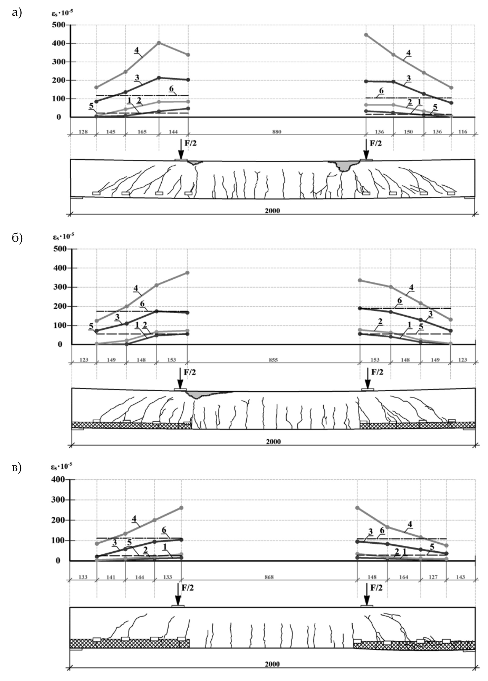10. Рис. 9. Графики деформаций арматуры в зонах поперечного изгиба образцов 2-й серии: а – эталонный образец (F⁰ᵤₗₜ = 114,4 кН); б – образец со степенью разрушения защитного слоя χ = 0,5 (F⁰ᵤₗₜ = 114,4 кН); в – образец со степенью разрушения защитного слоя χ = 1 (F⁰ᵤₗₜ = 63,0 кН); 1 – при нагрузке 0,16 F⁰ᵤₗₜ; 2 – при нагрузке 0,25 F⁰ᵤₗₜ; 3 – при нагрузке 0,55 F⁰ᵤₗₜ; 4 – при нагрузке 0,9 F⁰ᵤₗₜ; 5 – уровень нагрузки, соответствующий образованию нормальной трещины; 6 – уровень нагрузки, соответствующий образованию наклонной трещины
