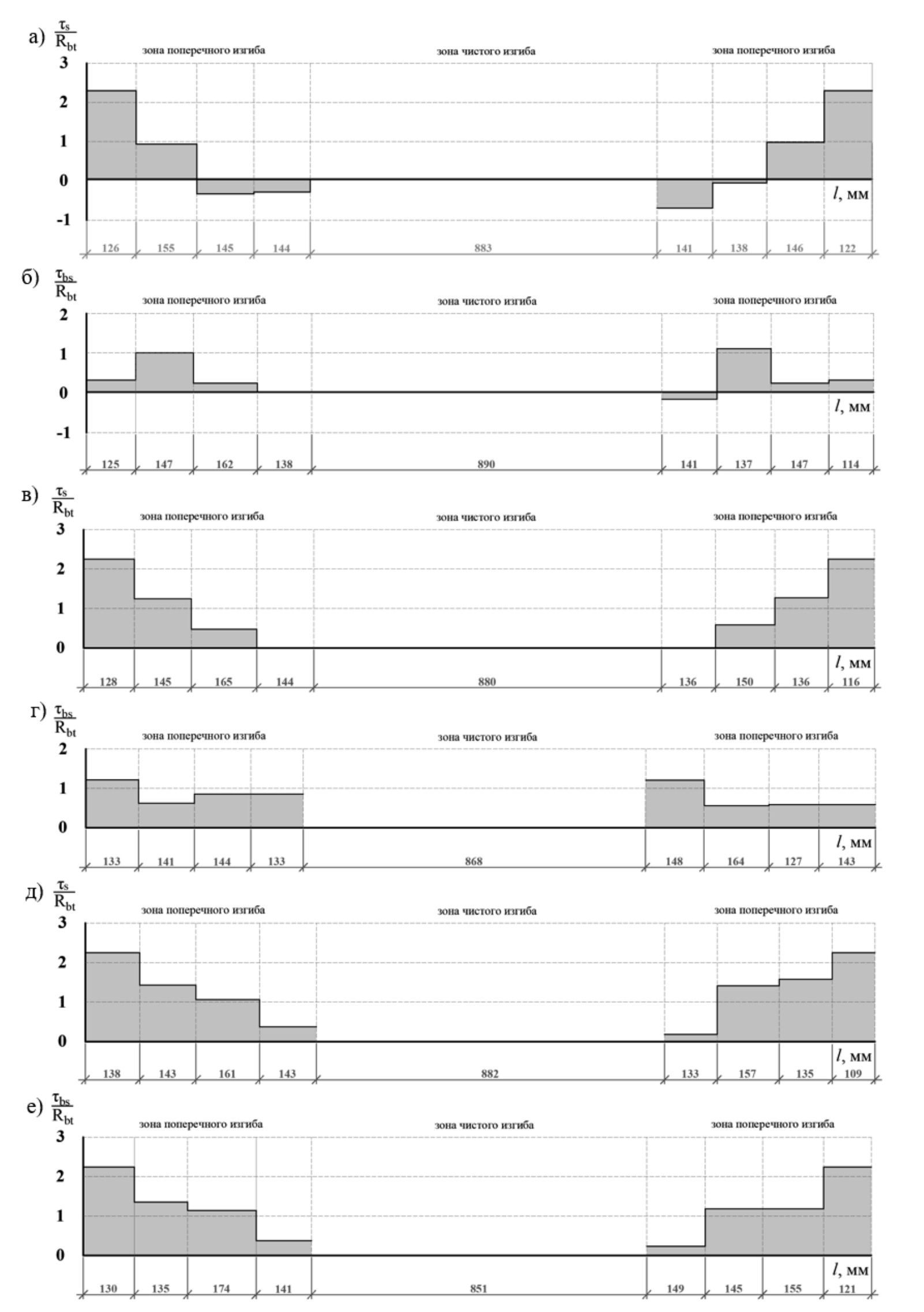 Рис. 11. Эпюры касательных напряжений по контакту арматуры с бетоном (а, в, г) и по контакту бетона образцов и восстановленного защитного слоя, разрушенного до полного оголения арматуры (б, г, д) в зонах поперечного изгиба при нагрузке 0,94 F⁰ᵤₗₜ; а – образец 10-Э; б – образец 10-1; в – образец 14-Э; г – образец 14-1; д – образец 20-Э; е – образец 20-1