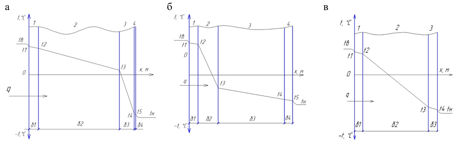 Рис. 1. Схемы наружных ограждающих конструкций зданий при расположении тепловой изоляции снаружи ограждения (а), с внутренней стороны ограждения (б), при отсутствии тепловой изоляции в ограждении (в): 1, 2, 3, 4 – номера слоев ограждения; t₁, t₂, t₃, t₄, t₅, – температуры на границах слоев ограждения; δ₁, δ₂, δ₃, δ₄ – толщины слоев ограждения; tв, tн – температура внутреннего и наружного воздуха