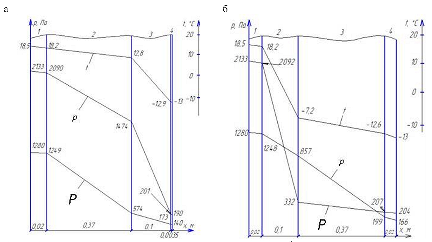 Рис. 2. Графики распределения температур и парциальных давлений водяного пара в ограждении при расположении тепловой изоляции снаружи ограждения (а), с внутренней стороны ограждения (б): 1, 2, 3, 4 – номера слоев ограждения; t – график изменения температуры; P – график изменения парциального давления водяного пара при полном насыщении; p – график изменения действительного парциального давления водяного пара