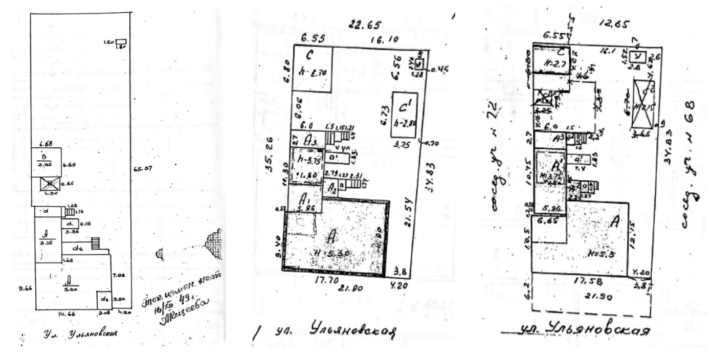 Рассматриваемый объект культурного наследия регионального значения «Особняк мещанина Галактионова Г.И.» расположен на территории исторического центра города Сызрани по ул. Ульяновской, 70. Здание расположено в окружении современной застройки средней этажности. Установлено, что основное здание ‒литера А ‒ по фрагментам фундаментов и схемам домовладений (рис. 1‒3) первоначально имело прямоугольную форму в плане с габаритными размерами 17,6×12,15 м. Позднее в глубине домовладения к основному зданию был пристроен деревянный прямоугольный объем – литеры А1, А3 с габаритными размерами 5,96×10,3 м.