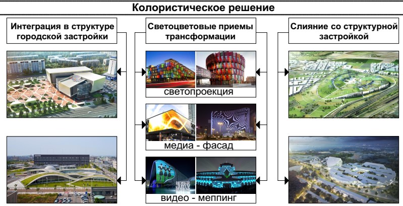 Рис. 3. Колористическое решение объектов научного и исследовательского профиля с учетом использования современных наружных отделочных материалов