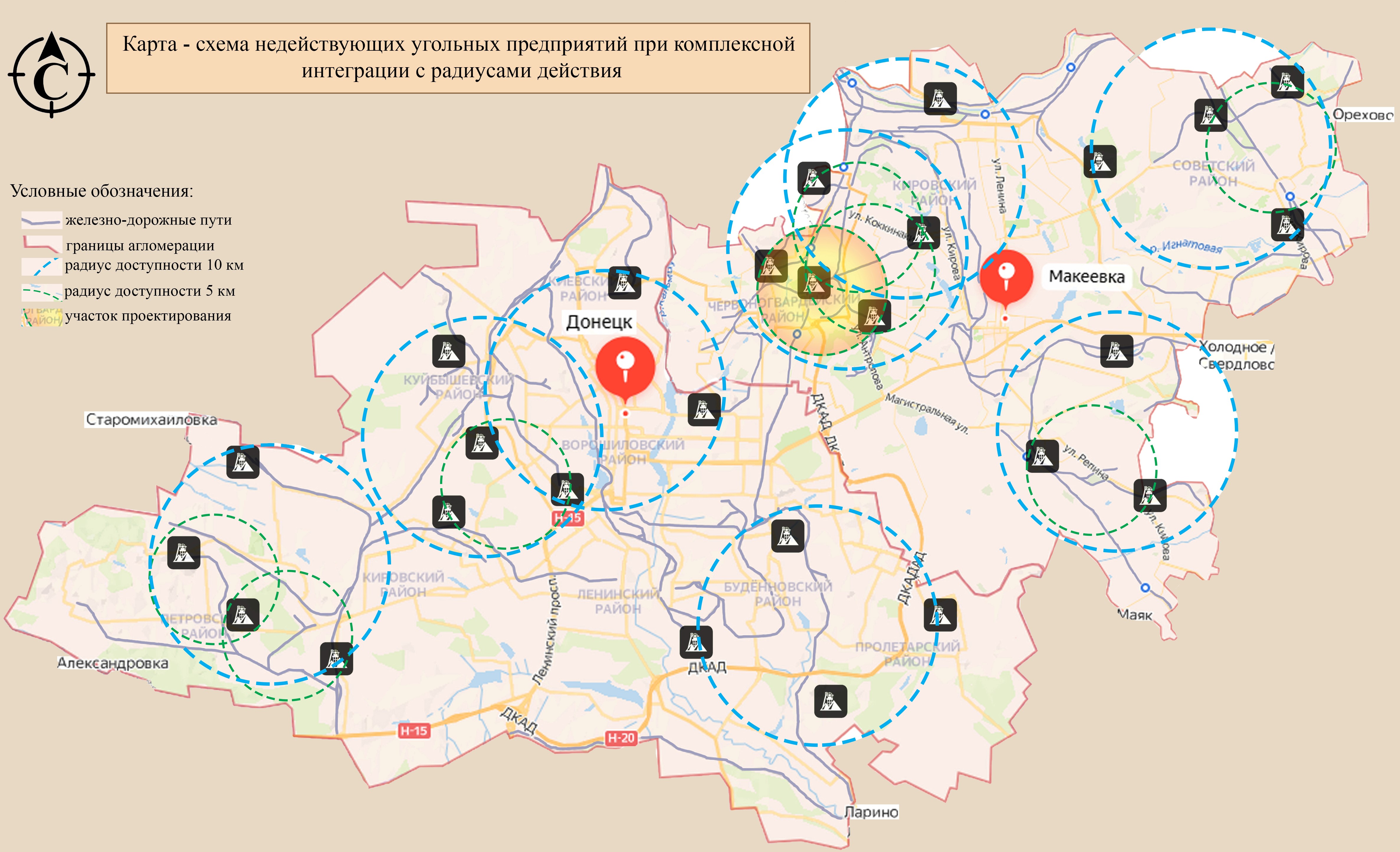 Карта-схема Донецко-Макеевской агломерации недействующих угольных предприятий при комплексной интеграции с радиусами действия