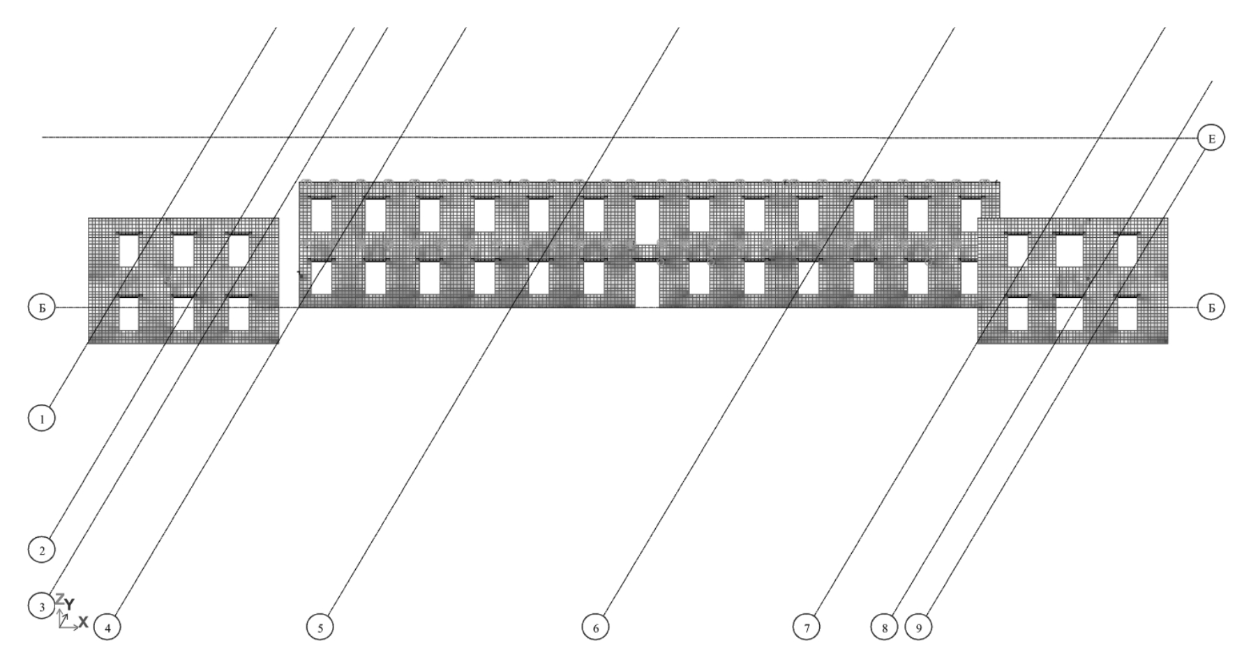 Пространственный расчет несущей системы (рис. 2) выявил зоны локальных разрушений, сосредоточенные в местах опирания балок перекрытий первого и чердачного этажей.