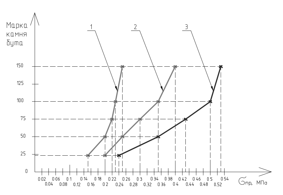 Рис. 4. Допускаемые напряжения в бутовой кладке стен от стальных распределительных пластин анкерных креплений деревянных балок, исключающие необратимые деформации и трещинообразование в швах при прочности кладочного раствора: 1 – соответствующего марке М4; 2 – соответствующего марке М10; 3 – соответствующего марке М25
