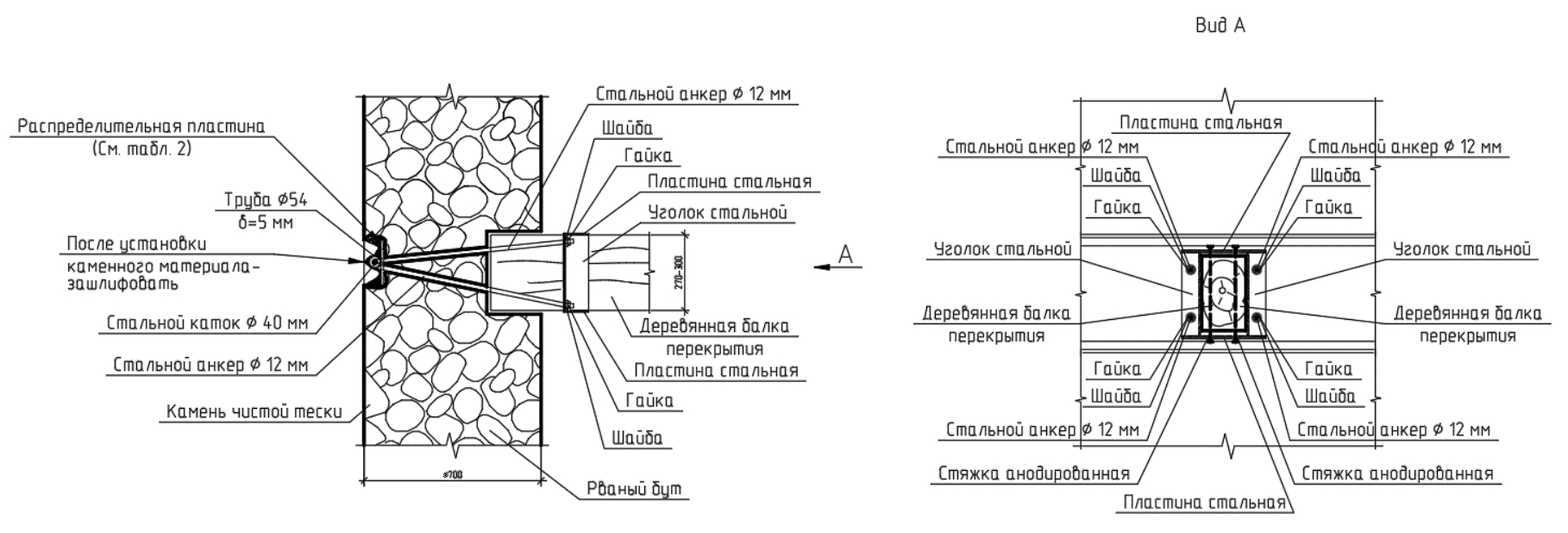 Для обеспечения лучшей пространственной работы стен и балочных перекрытий целесообразно выполнить следующее. Объединить стены при помощи анкерных креплений с деревянными балками перекрытий первого и чердачного этажей. В целях сохранения аутентичности фасадов распределительные стальные пластины маскируются в штрабах, закрываемых впоследствии фрагментами каменной нарезки.