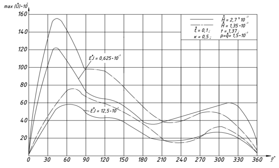 Из анализа графика зависимости величины максимального прогиба от величины сектора загружения временной нагрузкой (рис. 10) видно, что величина максимальных вертикальных прогибов в системе достигает своего наибольшего значения при величине центрального угла, изменяющегося в зависимости от жёсткости опорного контура от 90° (при малых жесткостях) до 180° при недеформируемом опорном контуре.