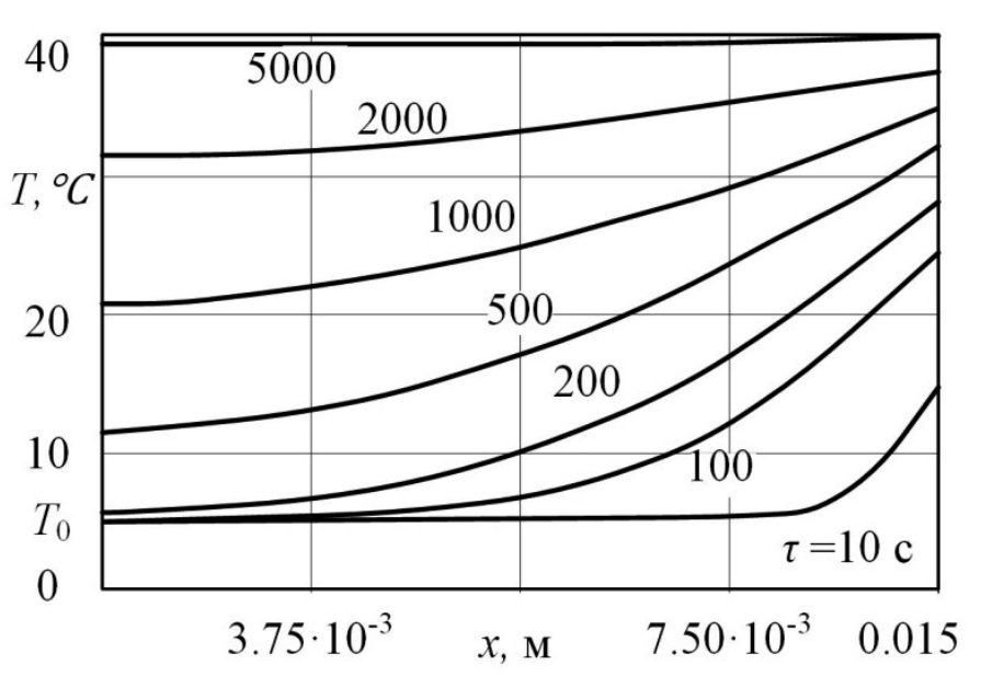 На рис. 4 приведен график распределения температурных кривых во времени в пористой пластине. Характер нагрева существенно отличается. Так, максимальная интенсивность нагрева (dT(x,τ) / dτ) наблюдается на поверхности и уменьшается в направлении к центру пластины.