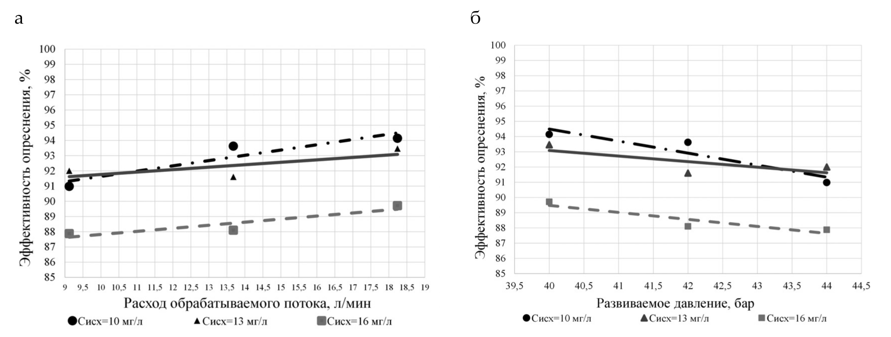 Графики эффективности процесса опреснения в зависимости от расхода при различных исходных концентрациях солесодержания представлены на рис. 4, а эффективности процесса опреснения в зависимости от давления при различных исходных концентрациях солесодержания ‒ на рис. 4, б.