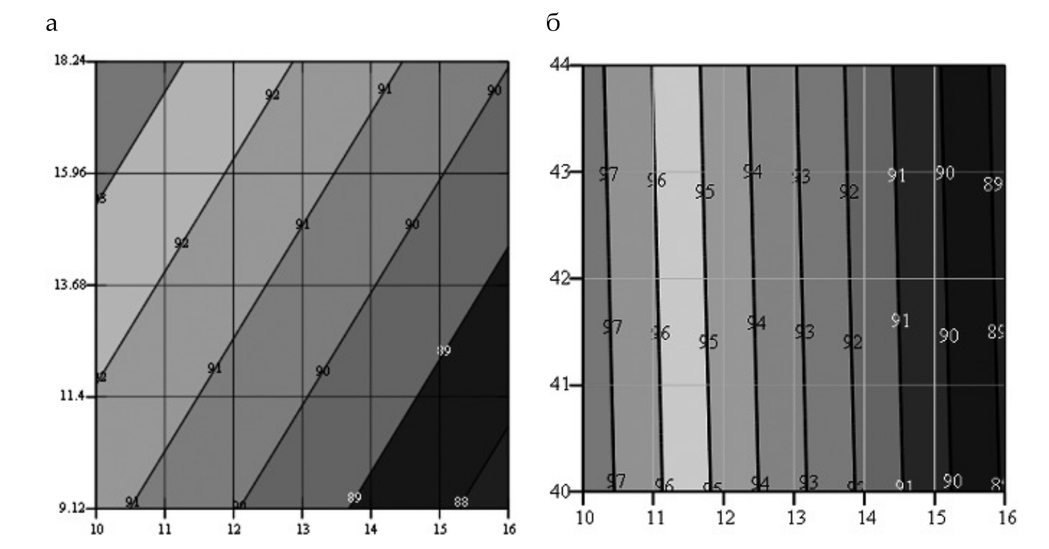 Функция отклика (математическая модель) | Y = 90,68-1,88X1+1,25X2 | Y = 93,1775-4,3825X1-0,1075X2 |
