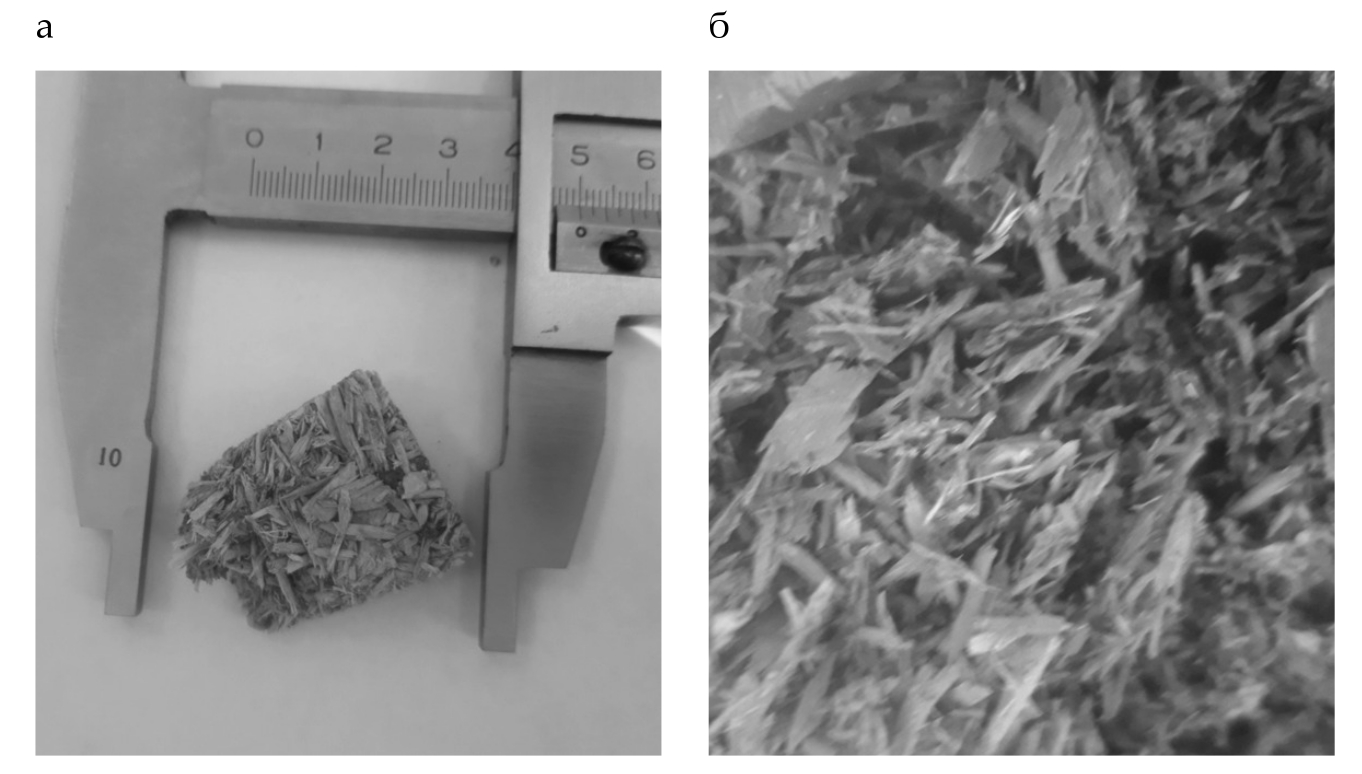 Рис. 1. Этапы переработки ДСП: а – дробление до крупности 50 × 50 мм; б – результат помола в шнековой мельнице