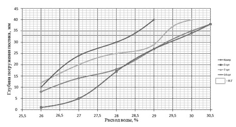 После необходимого времени выдержки проводились испытания по определению нормальной густоты цементного теста, при этом фиксировались промежуточные значения погружения пестика прибора Вика и определялось изменение его реологических характеристик для каждого из видов цемента и для жидкостей затворения, полученных из ДСП с эмиссией Е1(рис. 2‒4) и Е2 (рис. 5‒7).