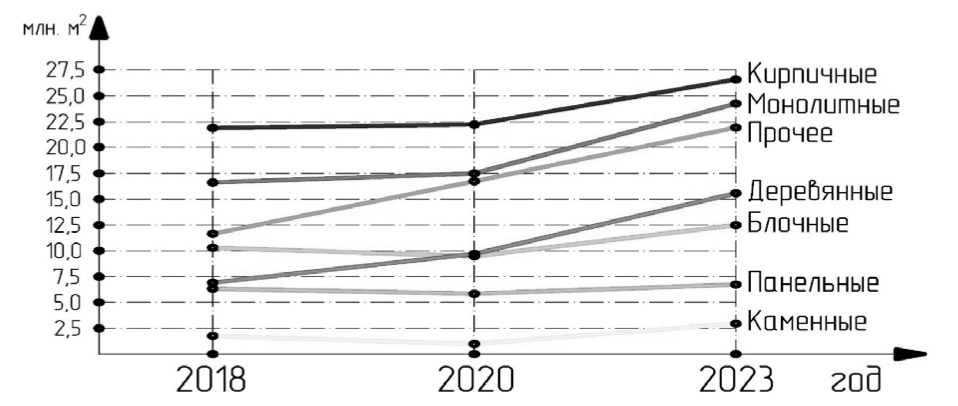 Согласно анализу проектных деклараций «ЕРЗ-Аналитика», статистика распределения строительных материалов среди жилых объектов в Российской Федерации показывает, что монолитное строительство имеет определенное место на рынке, а именно 21,78 % от общего объема ввода жилья на 2023 г. (рис. 1), хотя в последние годы потеряло лидирующие позиции в связи с удорожанием стоимости стали, а также уходом с отечественного рынка западных компаний [2].