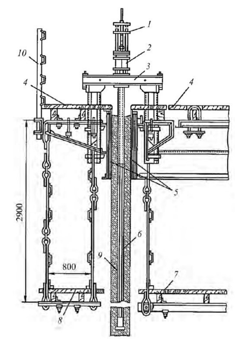 1 ‒ horizontal regulator; 2 ‒ hydraulic jack; 3 ‒ jack frame; 4 ‒ working flooring; 5 ‒ formwork panels; 6 ‒ homing rod; 7 ‒ internal suspended scaffolding; 8 ‒ external suspended scaffolding; 9 ‒ metal pipe; 10 ‒ external fencing