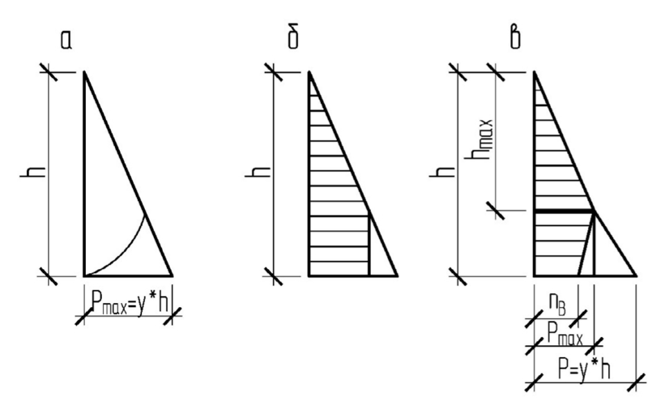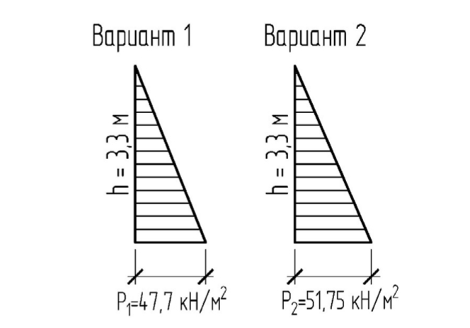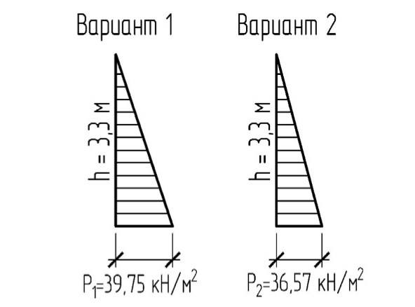 - Рассмотрим варианты бокового давления при изменении объемного веса бетонной смеси при p1 = 25,0 кН/м3 и p2 = 23,0 кН/м3.