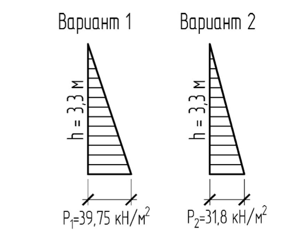 Рис. 4. Распределение бокового давления в опалубке для вариантов 1 и 2