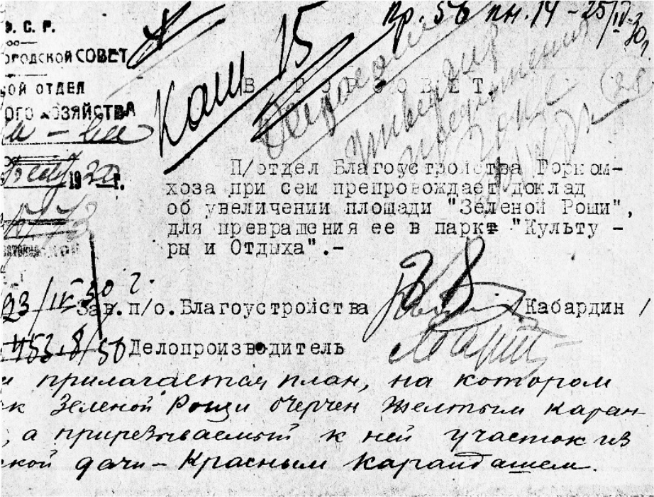 В фонде Р-56, Опись 1, Дело 338, Лист 30 обнаружен документ (рис. 1), содержащий информацию об обсуждении на Заседании Городского Совета, состоявшемся 25.04.1930 г., предложения о создании парка культуры и отдыха путем расширения существующих прогулочных территорий за счет присоединения к ним дополнительных участков, занятых частными дачами и садами [4]. Было предложено разместить там некоторые культурные предприятия и создать полноценное общественное пространство. Для этого планировалось выделить до 150 тыс. рублей. Участок «Зеленой Рощи», судя по архивным данным, был достаточно большим даже для массовых гуляний. Стихийно сложившаяся рекреационная территория не была насыщена каким-либо дополнительным функционалом, но уже привлекала множество жителей города. А в результате насыщения ее различными объектами посещаемость существенно выросла. В 1930 г. отмечалось, что в «Зеленой Роще» появились читальня, сцена, тир, физкультурные площадки и пр. Настоятельно требовалось расширение площади рекреационной территории. Особая важность предавалась соединению территории «Зеленой Рощи» с берегом р. Волги. Это существенно повышало привлекательность данного участка, а также эстетику и содержательность отдыха горожан. Решить эту задачу можно было путем присоединения к «Зеленой Роще» участков бывших дач, в том числе: 1) участок из бывшей Сипинской дачи, тогда занимаемой Крайздравом, 2) участок, занимаемый КРАЙЗУ и 3) один участок, арендуемый частным лицом под видом сада, хотя в этом саду совершенно не было плодовых деревьев. Такое увеличение территории – на 50 %, т. е. в полтора раза, увеличивало площадь будущего парка до 22 га. Без прирезки этих участков невозможно было бы разместить все предполагаемые сооружения для превращения «Зеленой Рощи» в парк «Культуры и отдыха».