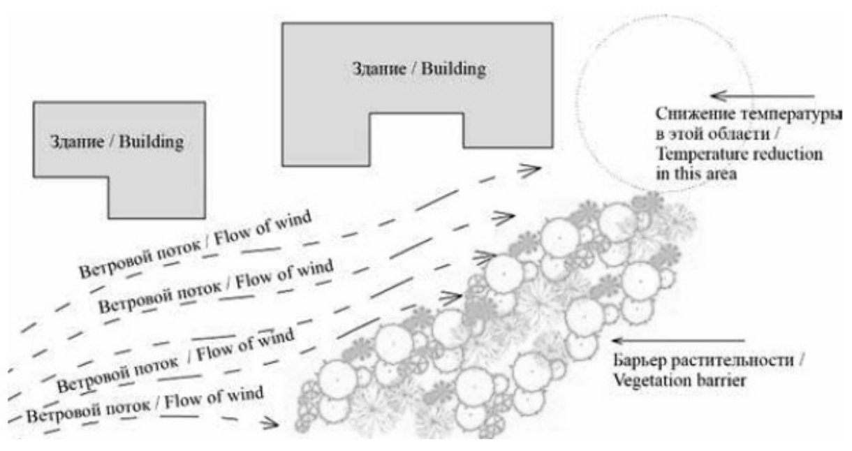 One of the features of the urban microclimate is the emergence of a «heat island», or «urban heat island». In this «island», the share of technogenic heat can reach half the value of solar radiation (fig. 4). In order to create green spaces that will contribute to the effective cooling of the urban environment, it is necessary to pay more attention to the spatial dimension of such areas for each specific area when planning them.