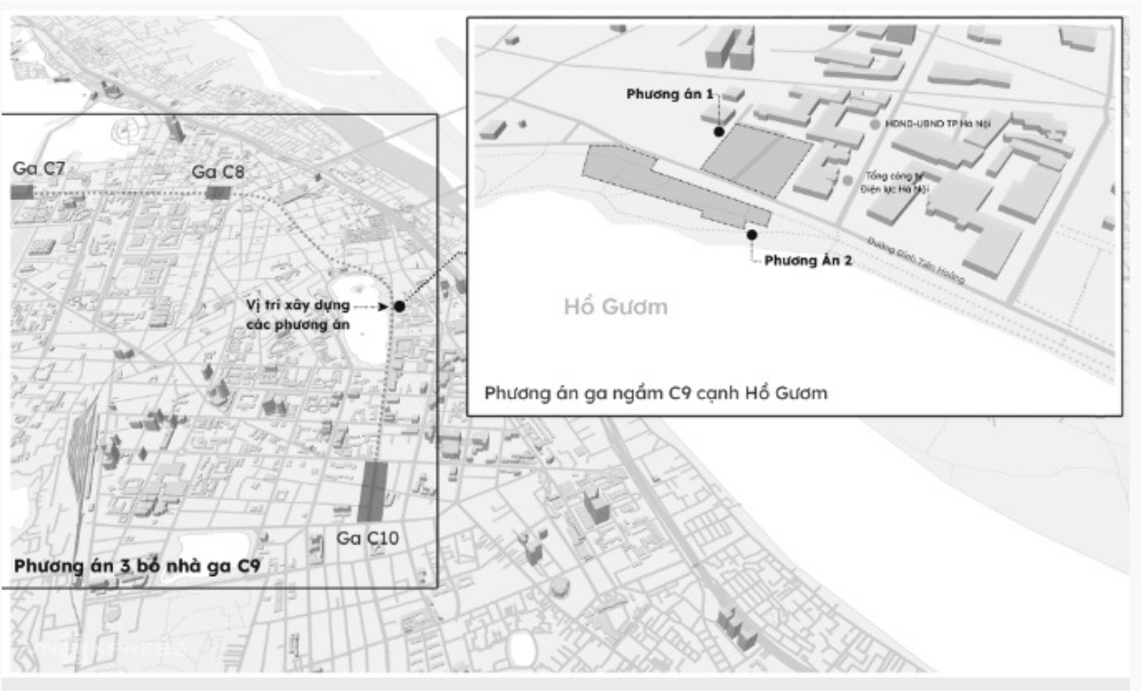 Fig. 5. Three options for metro station near Hoan Kiem Lake, Hanoi (Northern Vietnam)