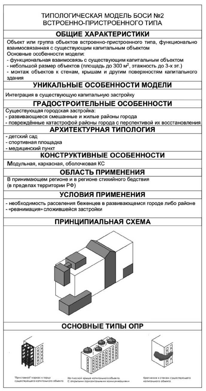 4.2. При реконструкции и реабилитации пострадавших от краткосрочного и среднесрочного ЧС городских районов, а также при интеграции временной архитектуры в сложившиеся городские районы применяется типологическая модель БОСИ встроенно-пристроенного типа (рис. 3).