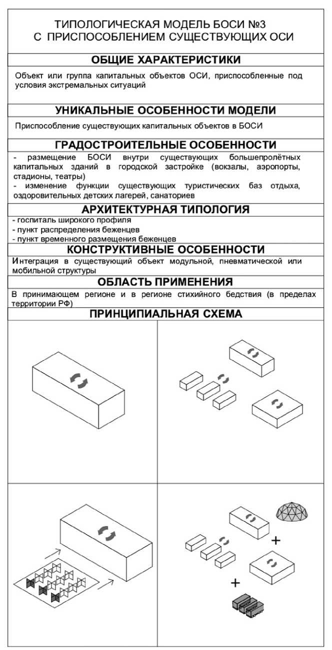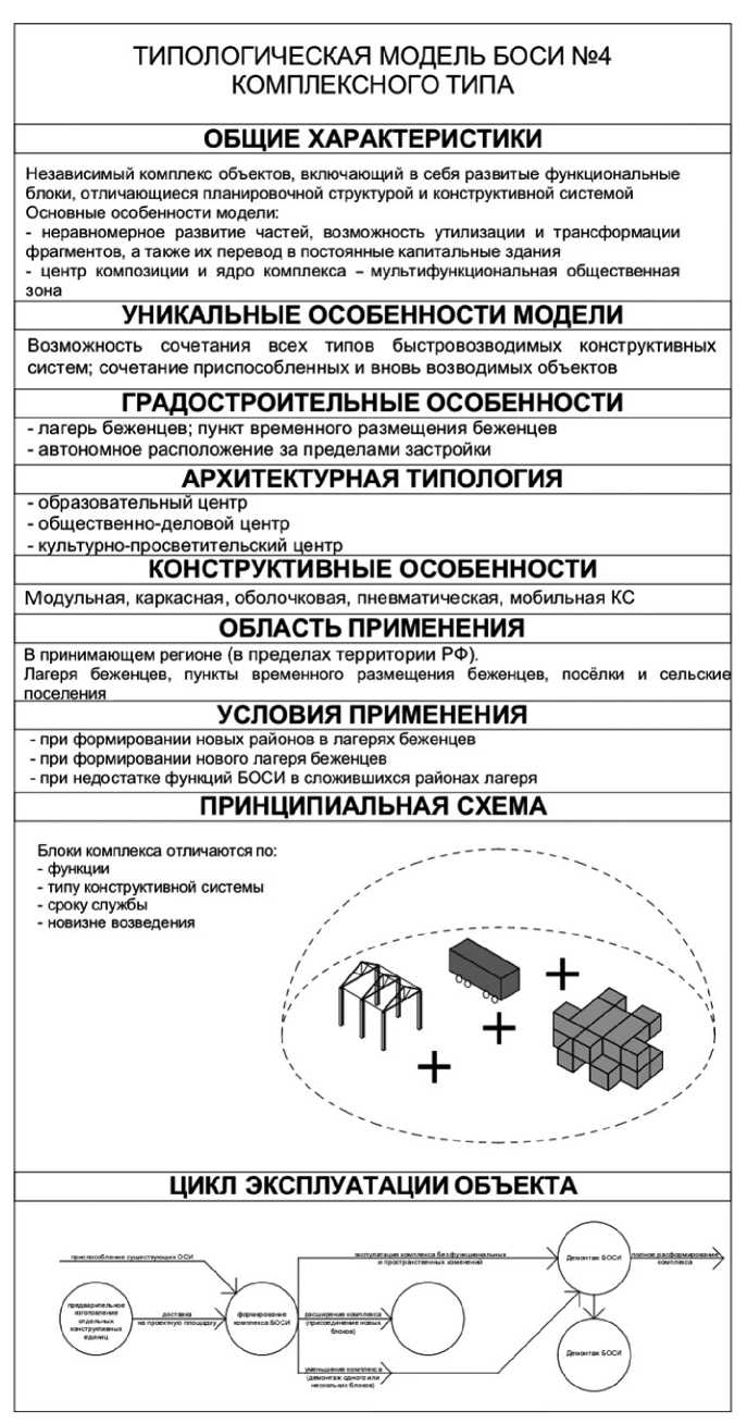 В этой связи и в определение понятия архитектура быстрого реагирования входит именно архитектура жилых объектов: «Архитектура быстрого реагирования – это архитектура временных, быстровозводимых жилых объектов и поселений как оказание первой помощи в условиях природных и социально-национальных катаклизмов, коммунальных катастроф (маневренный жилой фонд), а также при проведении культурных и спортивных мероприятий со значительным притоком туристов [11]. При работе с БОСИ, несмотря на типологические отличия, могут быть использованы принципы архитектуры быстрого реагирования».