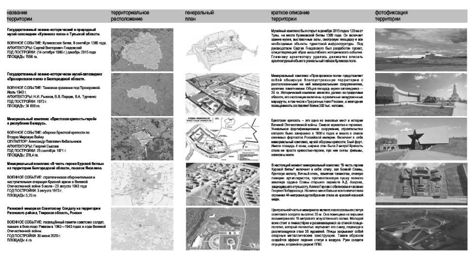Опираясь на анализ мирового опыта реновации территории объектов военной истории в структуре города, было выявлено, что основной вектор развития объектов историко-культурного наследия – это территории мемориальных комплексов [7, 8].