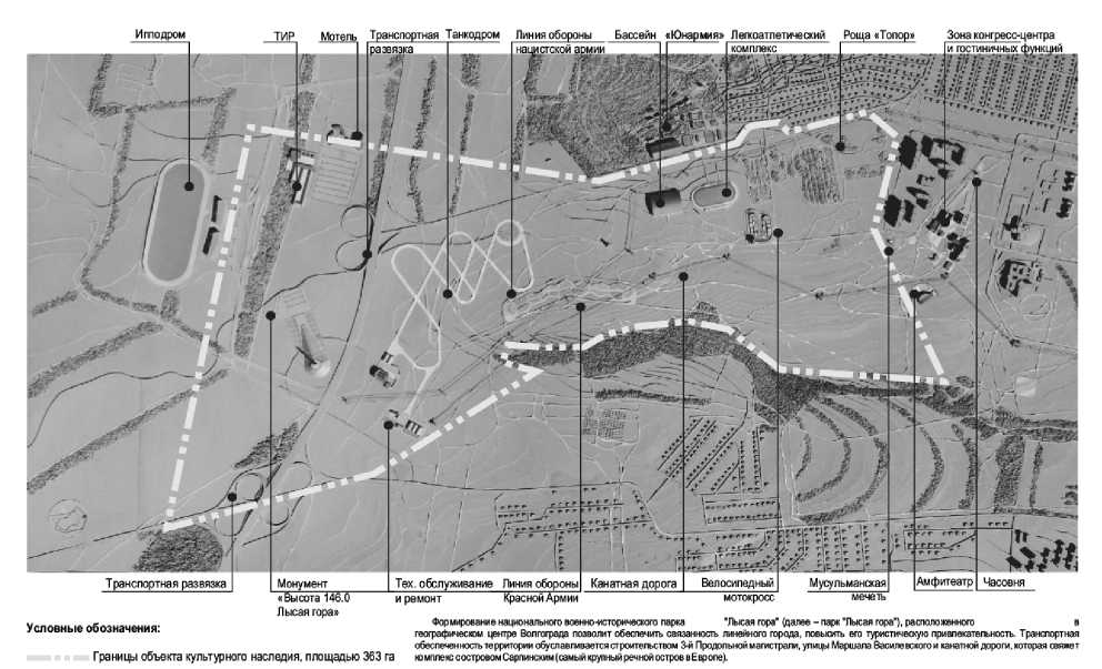 Формирование национального военно-исторического парка «Лысая гора», расположенного в географическом центре Волгограда, позволит обеспечить связанность линейного города, повысить его туристическую привлекательность (рис. 6).