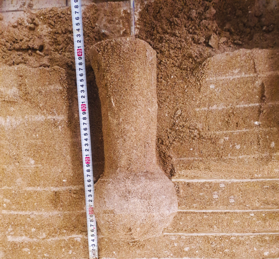 Проведённые дальнейшие исследования показали, что вспенивающаяся смола только пропитывает окружающий её грунт, без изменения напряженно-деформированного состояния (НДС) грунтового пространства вокруг сваи. Для подтверждения этого факта модель сваи с грунтополимерным уширением устраивалась в грунтовом лотке с прослоями из подкрашенного песка толщиной 5 мм, которые были отсыпаны через 50 мм и служили индикаторами изменения НДС. После выполнения всех этапов устройства сваи передняя стенка лотка разбиралась и модель откапывалась. По результатам опыта изменения положения индикаторных прослоев выявлено не было (рис. 5).