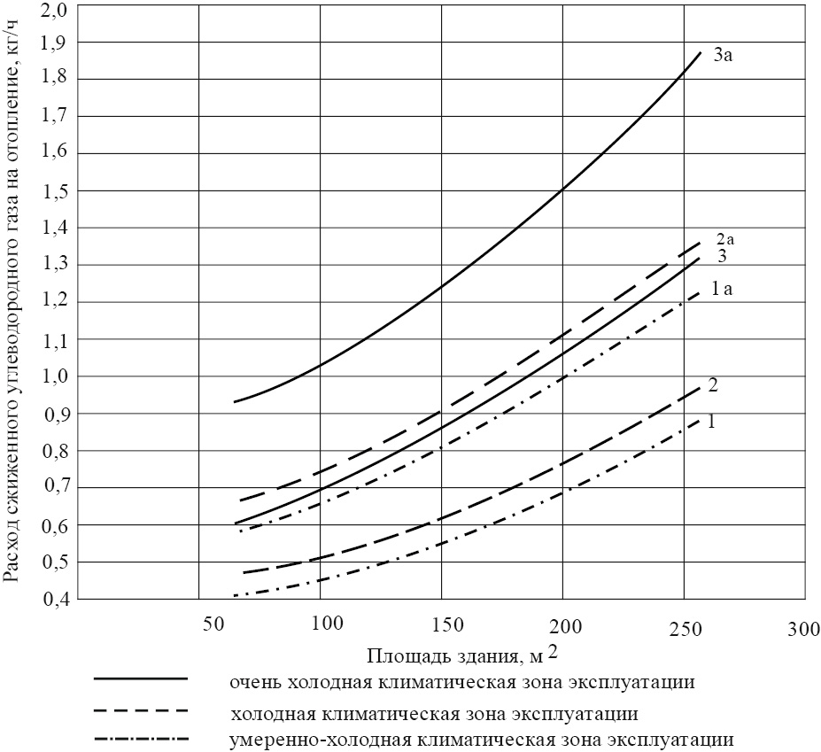 For modeling gas consumption for heating buildings: 1, 2, 3 – gas consumption at k = 1 according to (5), 1a, 2a, 3a – gas consumption at k = 10 according to (5)