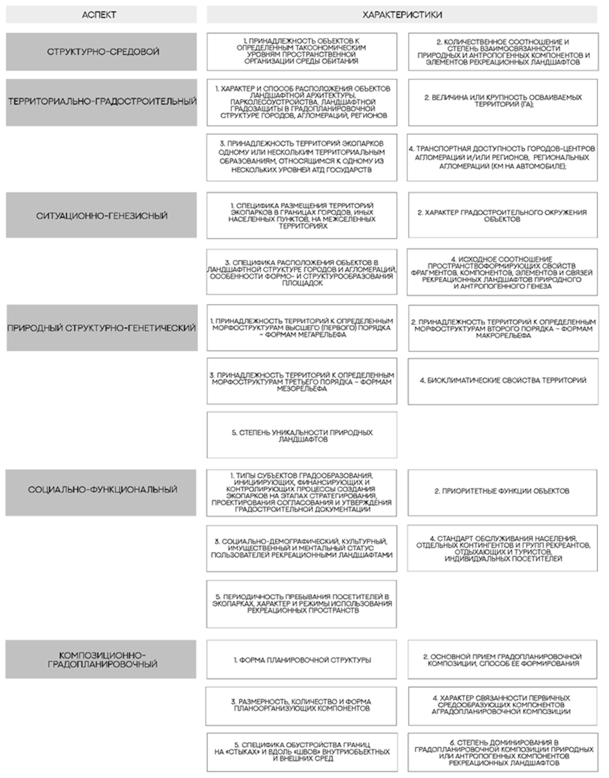 Определяющими для обособления сформировавшихся к настоящему моменту подтипов экопарков стали следующие их доминантные характеристики: принадлежность объектов к определенным таксономическим уровням пространственной организации среды обитания; величина их территорий (га); принадлежность территорий к определенным морфоструктурам мегарельефа и макрорельефа; соотнесенность территорий с определенными типами почв и классами растительных формаций, а также с подтипами почв и подклассами растительных формаций; периодичность посещения экопарков отдыхающими, рекреантами и туристами, характер и режимы использования рекреационных пространств.