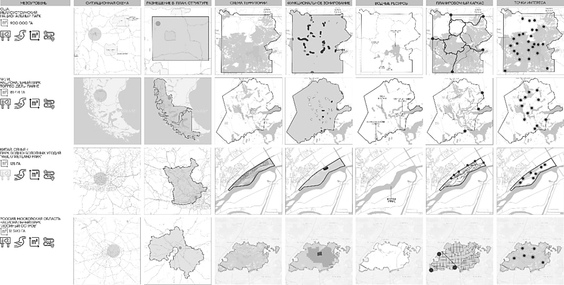 Для составления многомерной градостроительной классификации были рассмотрены зарубежные и отечественные примеры создания экопарков; значимыми в ходе анализа и оценки каждого из них являлись: характер размещения в территориально-градостроительной структуре городских агломераций и регионов, структурно-генетические качества местности [18], особенности функционального наполнения, структурно-планировочных и композиционно-пространственных решений [2, 4, 16], своеобразие методов, способов и приемов осуществления планировочно-ландшафтных преобразований [8, 14] и экологического регулирования и мониторинга природной (природно-антропогенной) среды [10, 12], специфика основных подходов к пространствообразованию [3, 13, 15, 16].