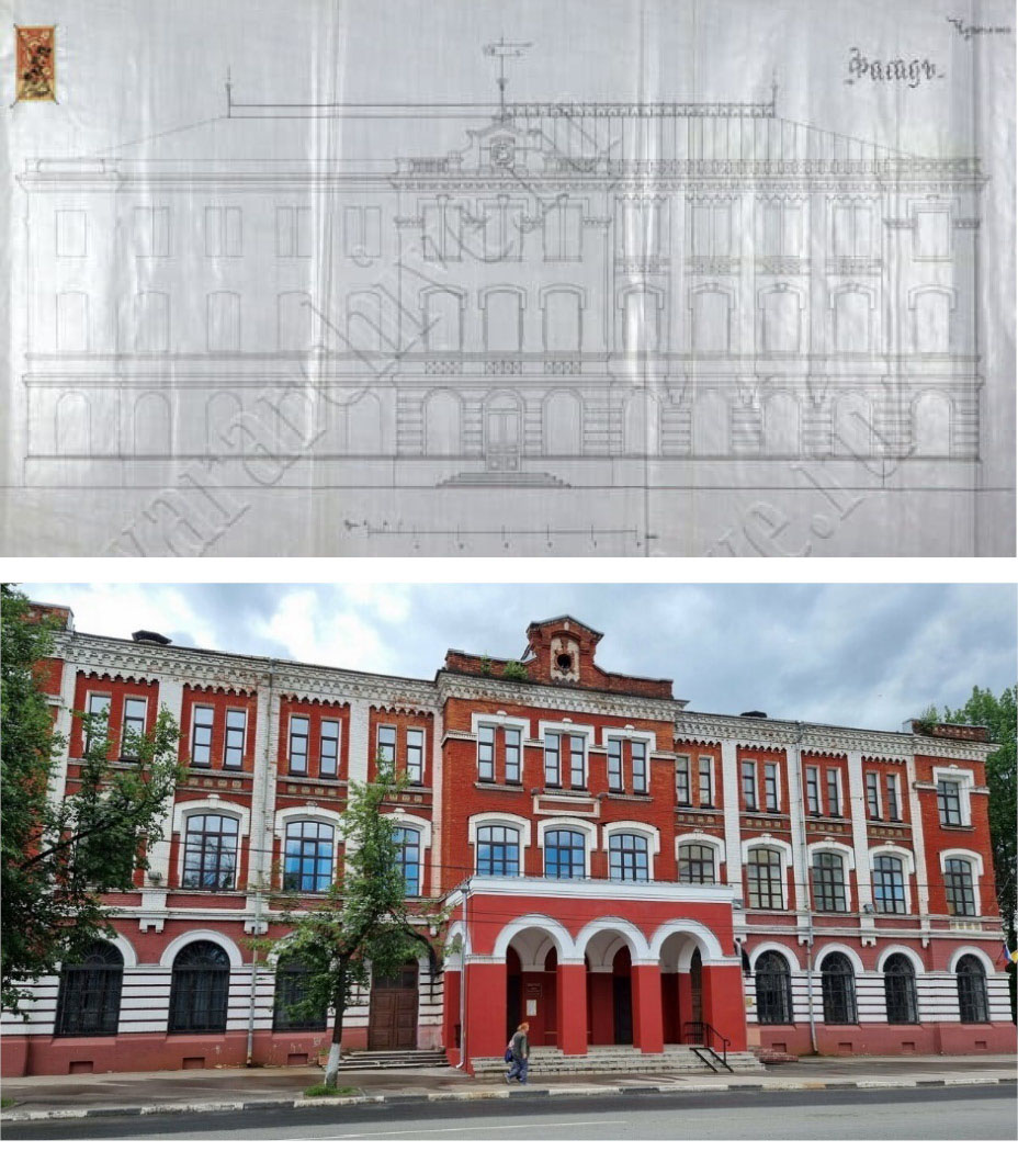 Рис. 1. Училище Товарищества ЯБМ (совр. – Межшкольный учебный центр Красноперекопского района), 1893-1894 гг. Чертеж фасада на кальке [7], современная фотография главного фасада [8]