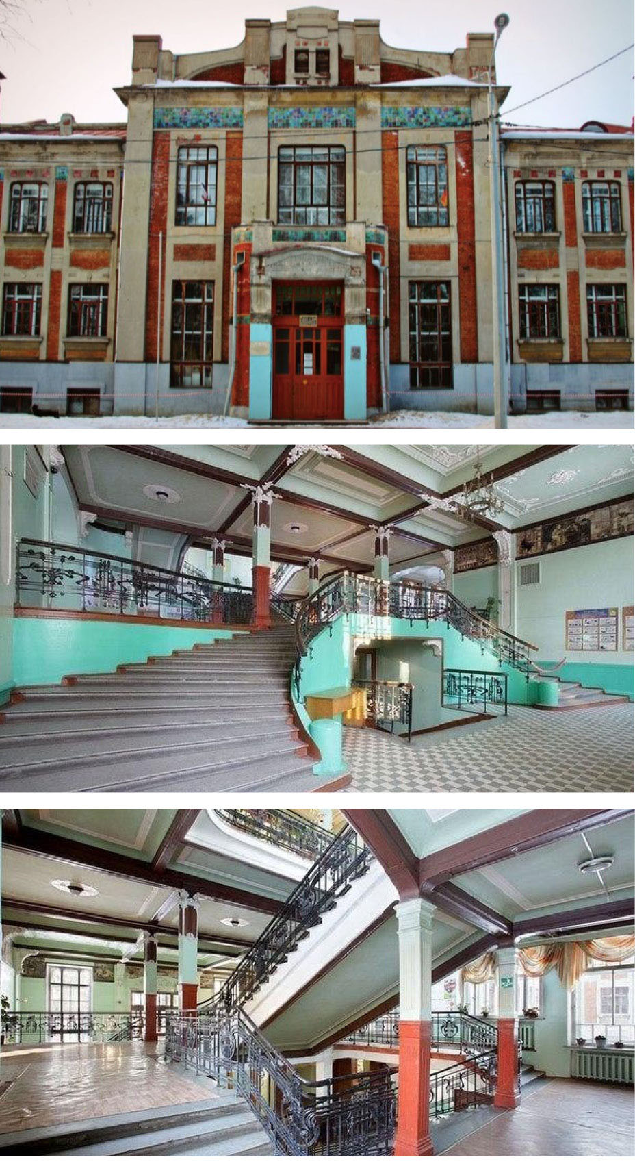 Другим примечательным объектом капитального строительства в дореволюционный период явилось здание фабричного двухклассного училища для детей цеховых рабочих (будущих работников предприятия) при Богородско-Глуховской мануфактуре Арсения Морозова, построенное в 1908 году (совр. школа № 10, г. Ногинск, Московская область) [9]. Выполненное в стиле модерна оно напоминало дворцовую постройку с характерными очертаниями окон и дверей, их переплетов, мозаичными вставками на фризе. А изящно прорисованные чугунные перила, пластичные кронштейны с флоральным орнаментом, кессонированные потолки с лепным декором, стеновые фрески с сюжетами на тему образования разных эпох и государств (Древний Египет, Греция, Русь) и многое другое – все элементы синтеза искусств делали его выдающимся художественным произведением наравне с другими типами зданий, выполненных в подобной архитектурной стилистике в данное время (рис. 2).