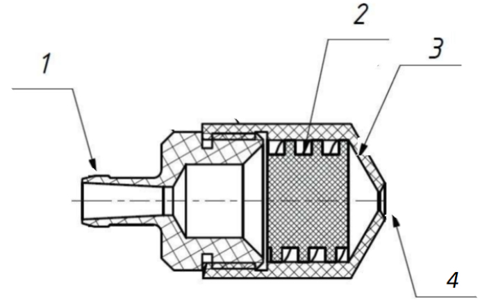 Fig. 1. Centrifugal nozzle: 1 ‒ inlet nozzle; 2 ‒ screw swirler; 3 ‒ twist chamber; 4 ‒ outlet nozzle