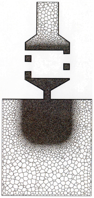 На рис. 2 показана геометрия расчетной модели. Особенностью расчетной модели является присоединенный объем на выходе сопла форсунки. Применение присоединенного объема позволяет получить параметры жидкостного факела. В области высоких градиентов параметров жидкостной струи для уменьшения размеров элементов сетки в модель включено вспомогательное тело.