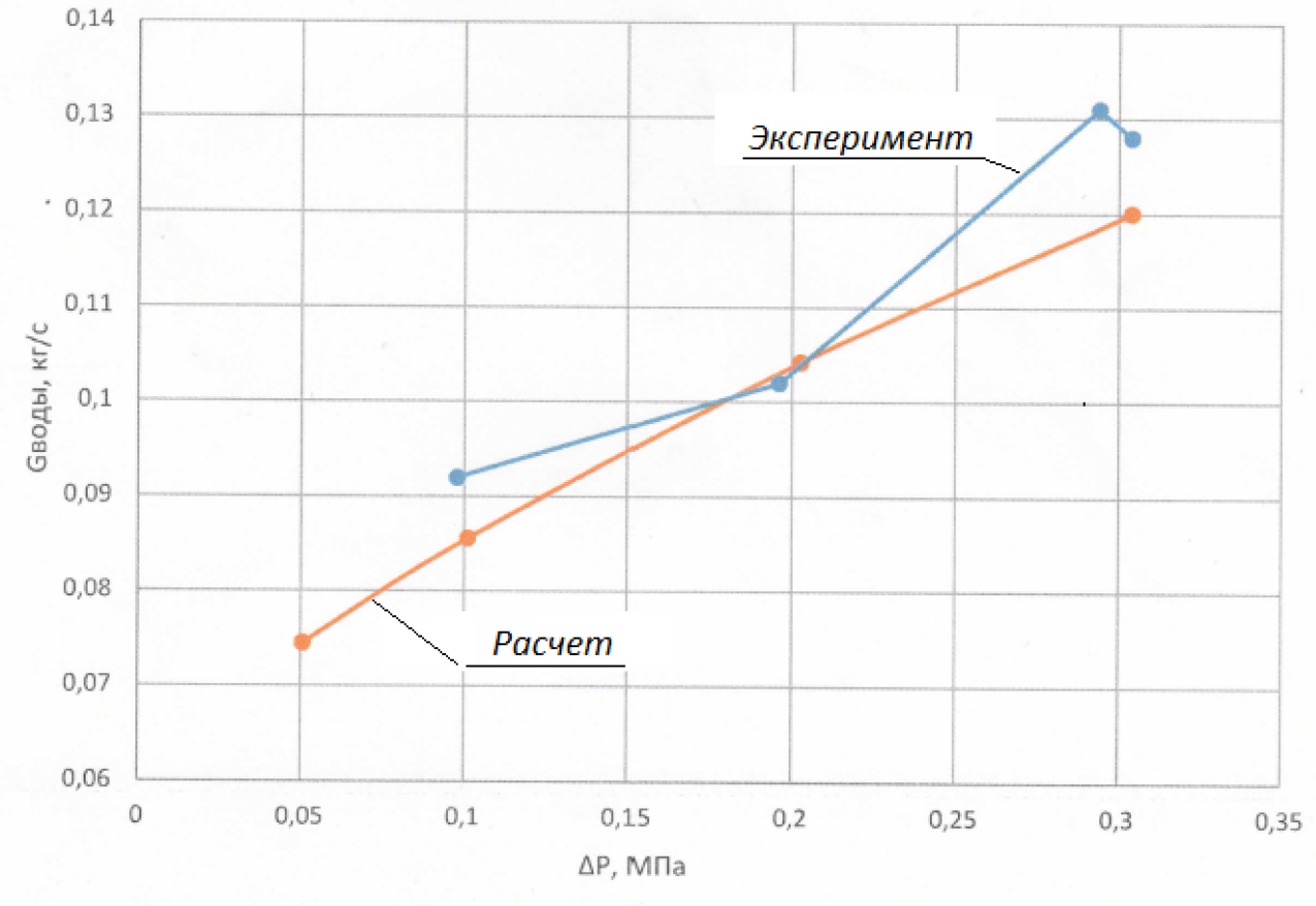 На рис. 9 показана расходная характеристика исследуемого варианта форсунки, вычисленная весовым методом в натурном эксперименте [6], и расходная характеристика форсунки из CFD-моделирования.