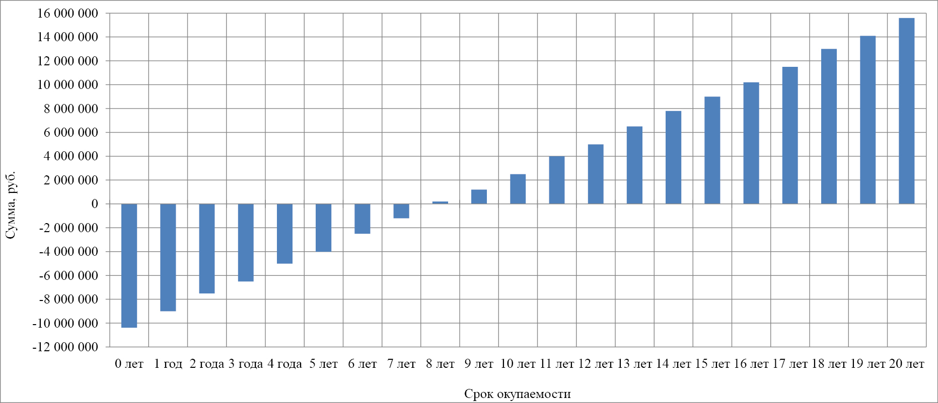 Окупаемость солнечных батарей зависит от множества факторов, включая стоимость самих батарей, тарифы на электроэнергию, уровень потребления и другие экономические условия. Министерство строительства и жилищной политики Удмуртской Республики утвердило тариф за электроэнергию на первое полугодие 2025 года: для городского населения он составит 5,04 руб./кВт·ч [17]. Таким образом, срок окупаемости солнечных панелей составит 8 лет при цене одной панели 26752 руб. и усредненными расходами на обслуживание. Диаграмма окупаемости солнечных батарей представлена на рис. 8.